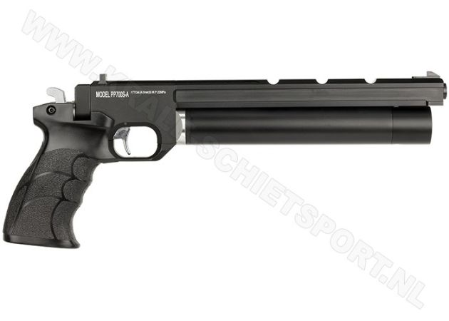 La Artemis PP700S-A es una pistola de aire comprimido PCP regulada de un solo disparo con sistema de amartillado de martillo. La bonita empuñadura negra sintética es universal y puede ser utilizada por tiradores zurdos y diestros.
