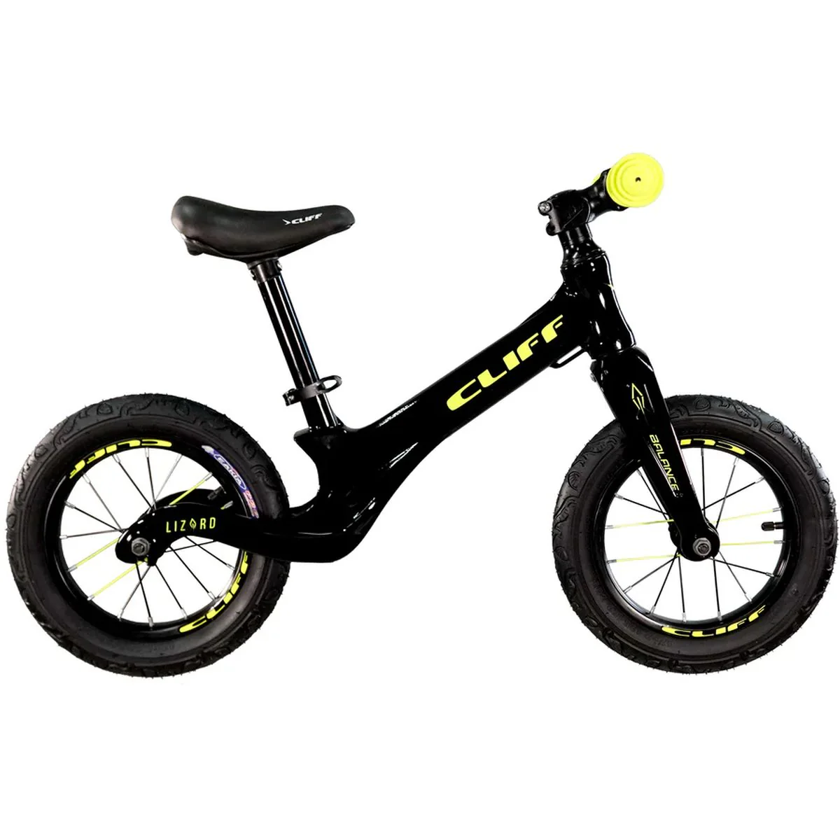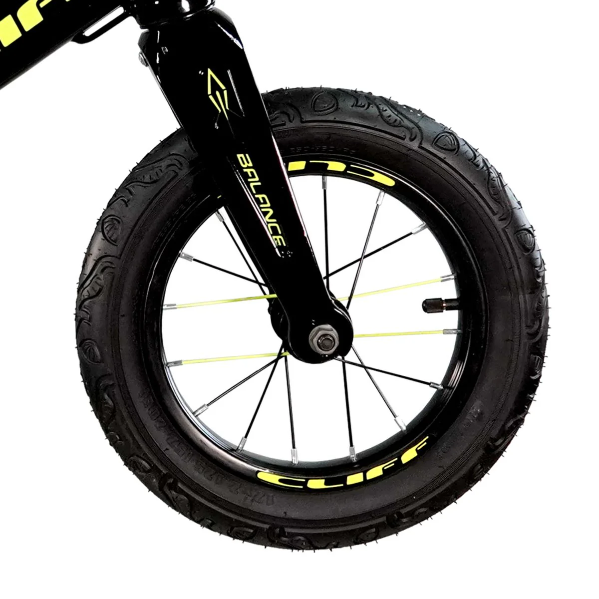 Equipada con un **tenedor de acero** y una **corona de aluminio**, esta bicicleta garantiza la seguridad y la estabilidad. Las **ruedas de 12 pulgadas en aluminio Cliff** y el **sillín Cliff** brindan una conducción cómoda, mientras que los **posa pies con lija** le dan al niño un lugar seguro para apoyar sus pies y practicar el deslizamiento.