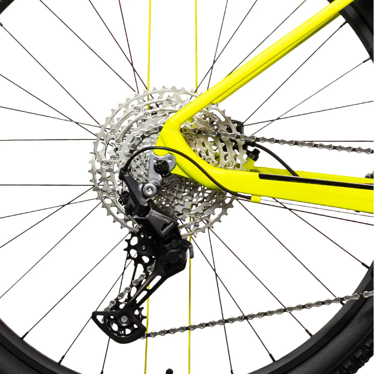 El grupo de componentes incluye un sistema **Shimano Deore M5100** de **11 velocidades con monoplato Prowheel Charm**, ofreciendo una relación de 11-50 y 32T para afrontar ascensos y descensos con facilidad. Los **frenos de disco hidráulicos Tektro HD-M275** garantizan un frenado potente y seguro en cualquier condición.