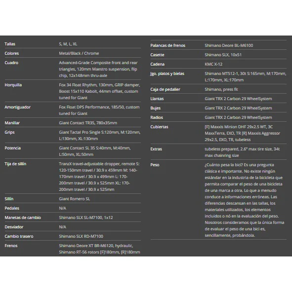 Llantas: [F] Maxxis Minion Dhf 29X2.5 Wt, 3C Maxxterra, Exo, Tr [R] Maxxis Aggressor 29X2.5, Exo, Tr, Tubeless.