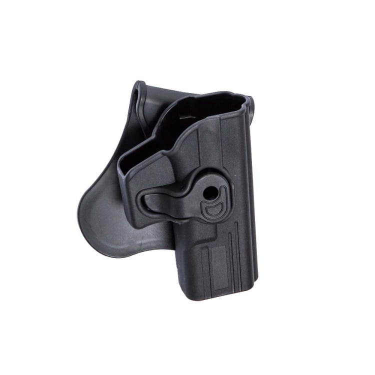 Descripción Hechas de polímero negro duradero y de alta tecnología, las fundas tácticas Quick Release pueden girar 360 grados en posición fija cada 9 grados, lo que permite un ajuste fácil para cada aplicación. Con la gran palanca de liberación / bloqueo, el arma se asienta firmemente y se asegura dentro de la funda para todas las situaciones exigentes. La funda viene de serie con una montura de paleta para cinturones de hasta 42 mm de ancho o cinturas de pantalón que permite el transporte oculto. La paleta presenta una parte posterior de goma para mayor comodidad y mejor agarre. Caracteristicas: – Sistema de bloqueo automático – Retención fácil – Perfección ergonómica
