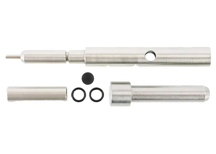 Parte de este kit es una sonda de pellets de 5,5 mm (.22) cuya longitud se puede ajustar mediante un tornillo allen en la parte trasera. Con un casquillo incluido que se desliza con un ajuste de interferencia, la sonda también es adecuada para el calibre 6,35 mm (.25). La posición del asiento, es decir, hasta qué punto se empujan las balas dentro del cañón, influye en la precisión y esta sonda de perdigones ajustable le proporciona los medios para experimentar con eso. Una característica importante, ya que puedes ajustar una babosa específica.