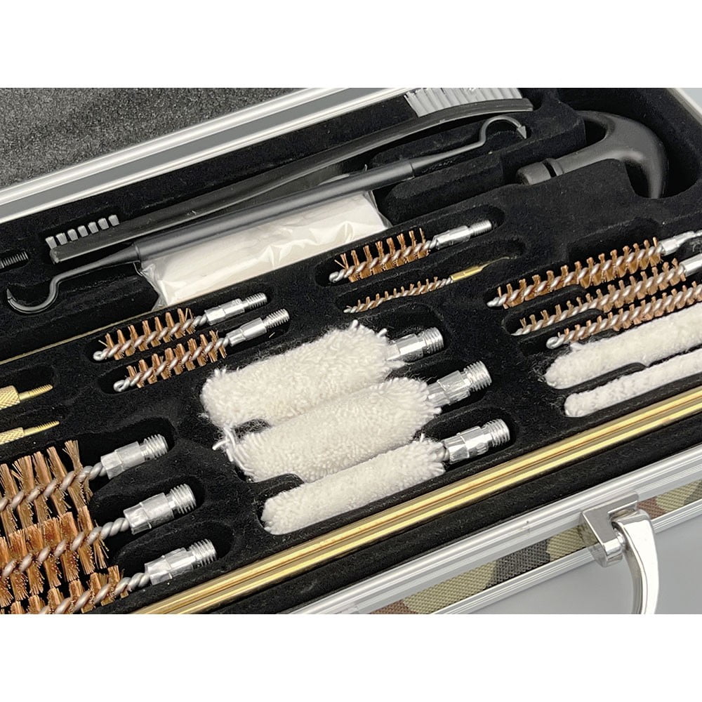 Kit muy completo para la conservación y limpieza de armas de distinto calibre presentado en maletín de acero inoxidable con doble cierre metálico y asa de agarre que incluye más de 20 piezas.
