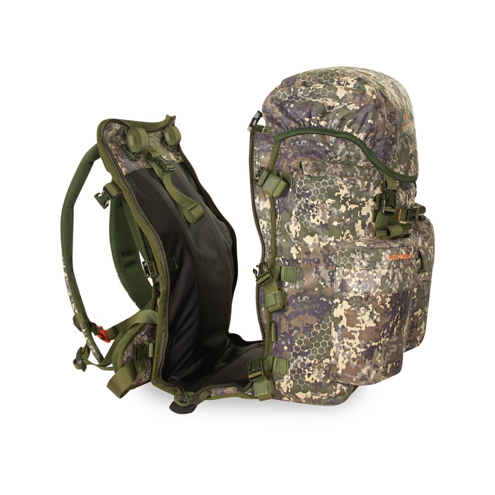 La mochila Suede Camo 65 PF PRO de Nature by Marsupio, confeccionada en suave y duradero material SUEDE, ha experimentado una completa revisión y mejoras significativas que la convierten en una opción más técnica e innovadora que nunca. La característica más destacada de esta mochila es su capucha desmontable, que proporciona una cobertura completa sobre el compartimento central. Esto significa que estás preparado para enfrentar cualquier condición climática.