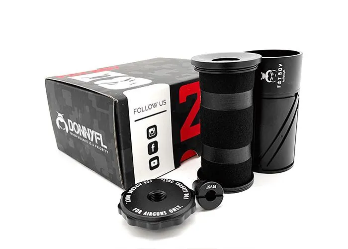 Es compatible con calibres de 4,5 mm hasta 7,62 mm, DonnyFL envía el moderador Fatboy con 3 extractores de aire intercambiables, para que cada calibre tenga la menor cantidad de aire escapando del frente. La tapa trasera con rosca ½ UNF ha sido rediseñada, ahora proporciona más agarre para una fácil fijación del moderador.
