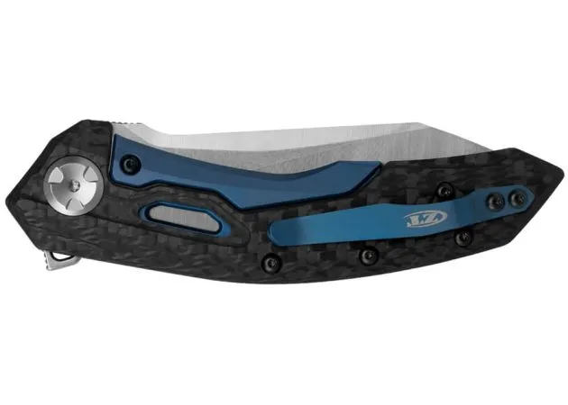 La empuñadura consta de dos escalas que están hechas de carbono. Fibras de carbono tejidas en resina sintética que se comprime en un material muy ligero y de gran resistencia. Tiene un aspecto moderno que combina bien con la forma de la hoja. La empuñadura de esta navaja Zero Tolerance 0762 tiene dos aberturas a través de las cuales se pueden ver los revestimientos de titanio. Uno de esos revestimientos es azul anodizado, lo que también contribuye a la apariencia moderna.