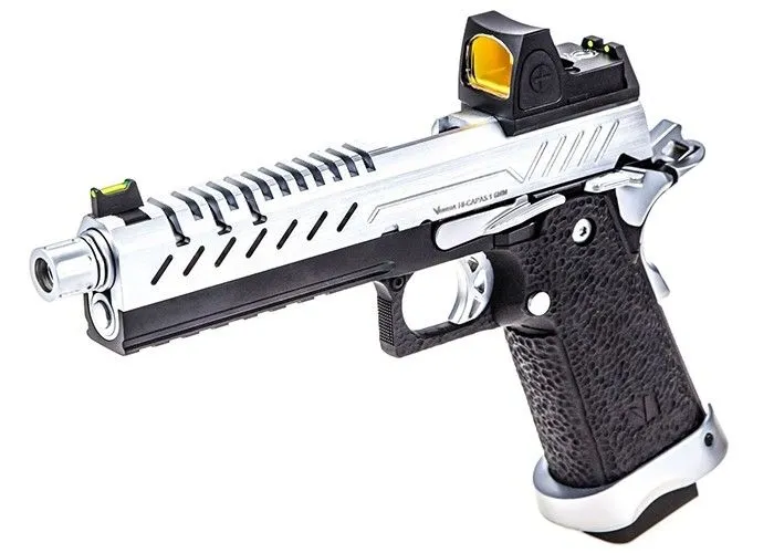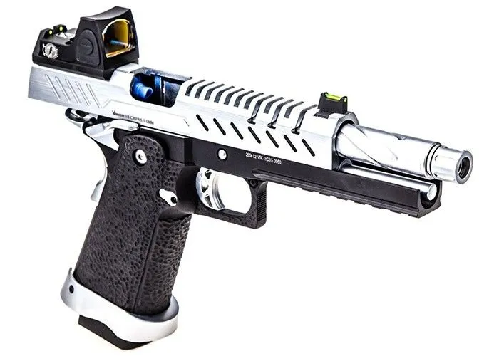 El Nuprol Vorsk Hi-Capa 5.1 + BDS Black/Chrome está diseñado con información del mundo del airsoft y con la experiencia de un productor establecido. La corredera ranurada mecanizada por CNC le permite admirar las ranuras en espiral mecanizadas en el exterior del cañón de 6,3 mm, lo que le da a esta pistola de airsoft una apariencia propia reconocible. El cañón tiene una rosca en el extremo y viene con un protector de rosca para cuando no quieras utilizar un silenciador o una unidad trazadora.