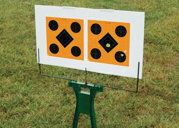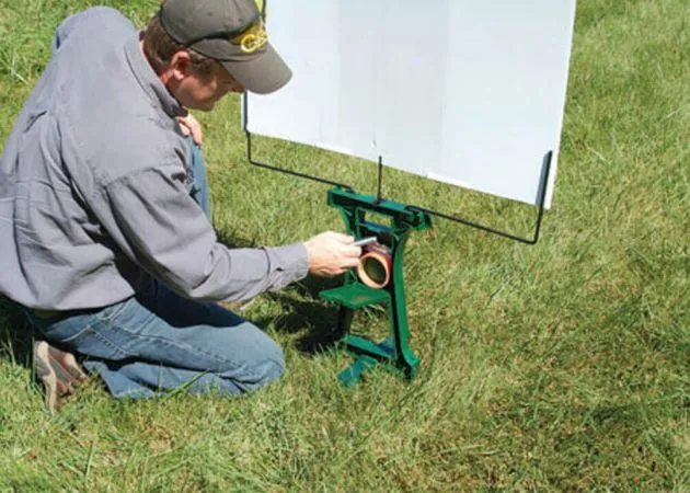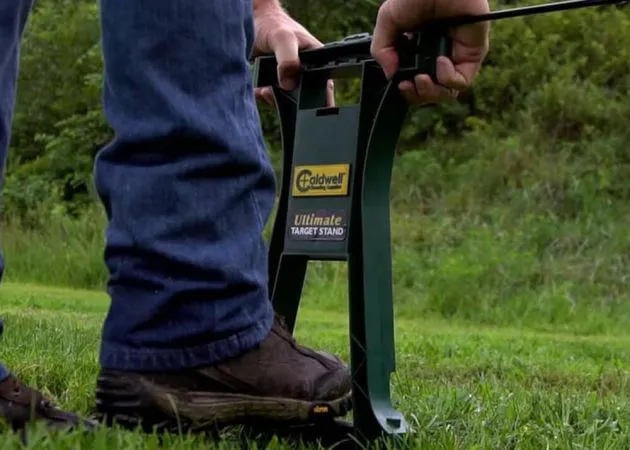 El blanco de tiro Ultimate Stand de Caldwell consta de una base que está hecha de material sintético y tiene brazos de acero duraderos que mantienen el objetivo alto. Hay un estabilizador de suelo separado en la parte inferior de la base, que se puede quitar y colocar para estabilizar aún más el objetivo de tiro. Además, hay dos pasadores en el pie de la base, que se pueden usar para plantar firmemente el objetivo de tiro Caldwell Ultimate Stand. Hay un agujero en la mitad inferior de la base donde puedes colocar el pie para clavar los pasadores en el suelo.