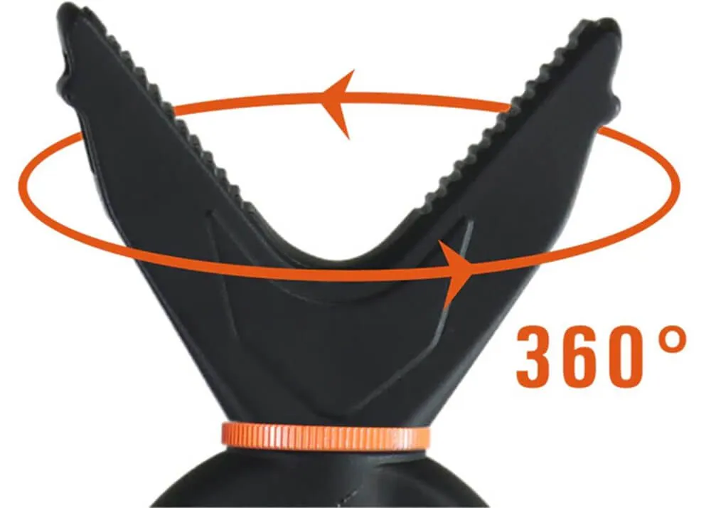 La longitud del bastón de tiro se puede ajustar fácilmente desde una longitud mínima de 560 mm hasta una longitud máxima de 1575 mm, gracias a los cierres rápidos de las patas. Hay un yugo en forma de V en la parte superior del bastón de tiro Vanguard Scout M62, que se puede girar 360 grados. El yugo está revestido de goma, lo que garantiza que el rifle permanecerá allí de forma segura.