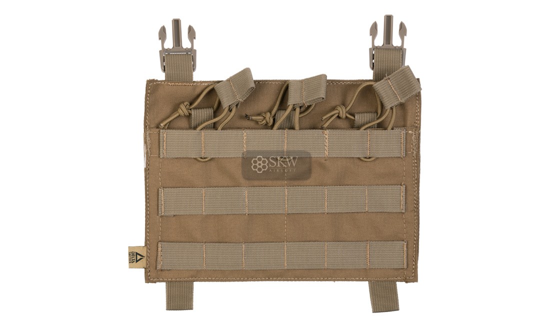 Panel frontal preconfigurado de Delta Tactics con clips machos con 3 pouches de extracción rápida con una goma de sujeción en la parte superior para 3 cargadores de tipo AR, G36, AK… Y parte frontal con sistema molle para poder acoplar más accesorios.