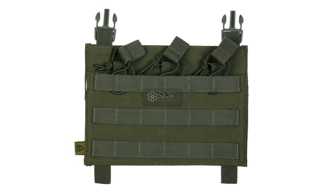 Panel frontal preconfigurado de Delta Tactics con clips machos con 3 pouches de extracción rápida con una goma de sujeción en la parte superior para 3 cargadores de tipo AR, G36, AK… Y parte frontal con sistema molle para poder acoplar más accesorios.