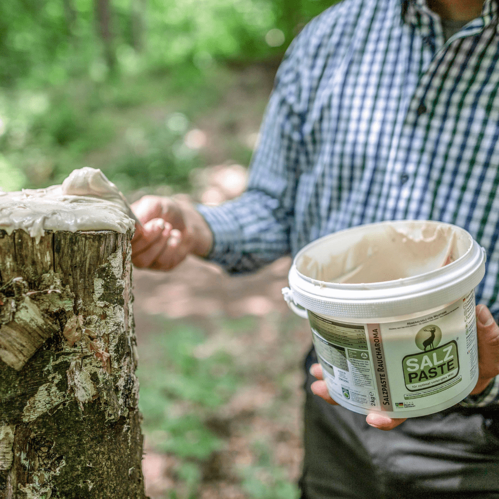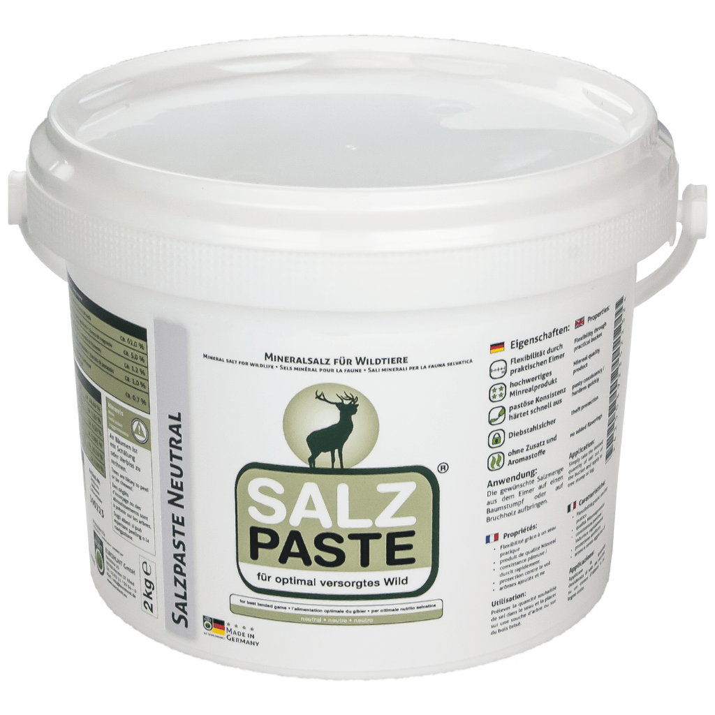 Nuestra pasta de sal es un producto mineral de alta calidad con una consistencia pastosa. Debido a la aplicación flexible, es posible suministrar de manerasencilla las sales  minerales necesarias en cualquier punto deseado de la zona. Gracias al práctico envase, puedes llevar contigo la pasta de sal sin ensuciar el vehículo ni a ti mismo . Simplemente esparce la cantidad deseada de sal en un tocón de árbol o madera rota y deja que se endurezca. La ventaja adicional de Waidmann: no se puede robar pasta de sal.