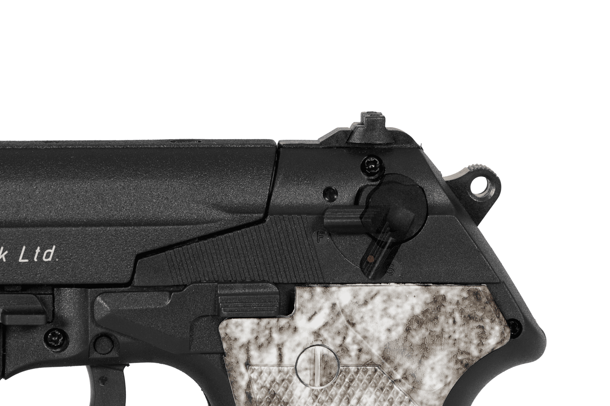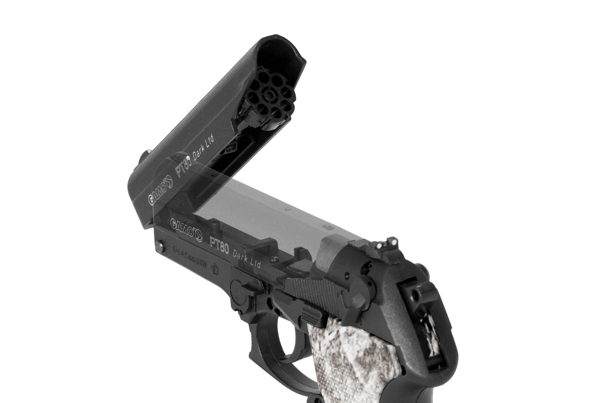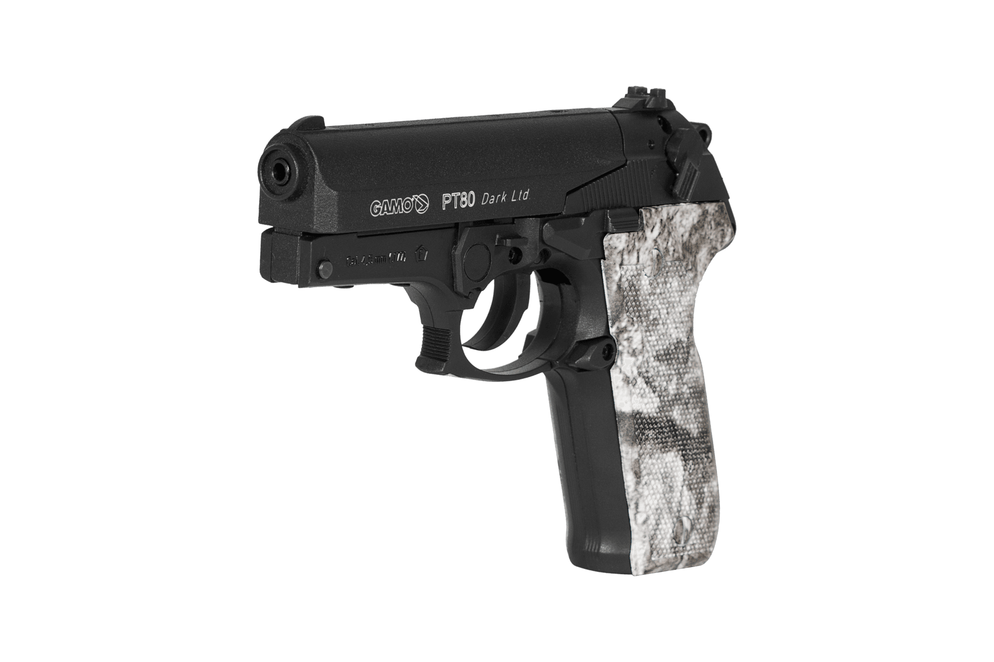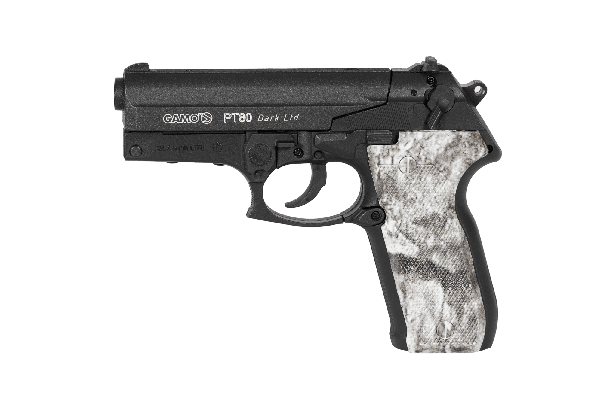 La belleza hecha Pistola. La pistola PT-80 Dark es una pistola de aire comprimido de CO2 con exclusividad para el mercado español. Una joya de la marca Gamo que brilla por su precisión, potencia y estética a partes iguales.