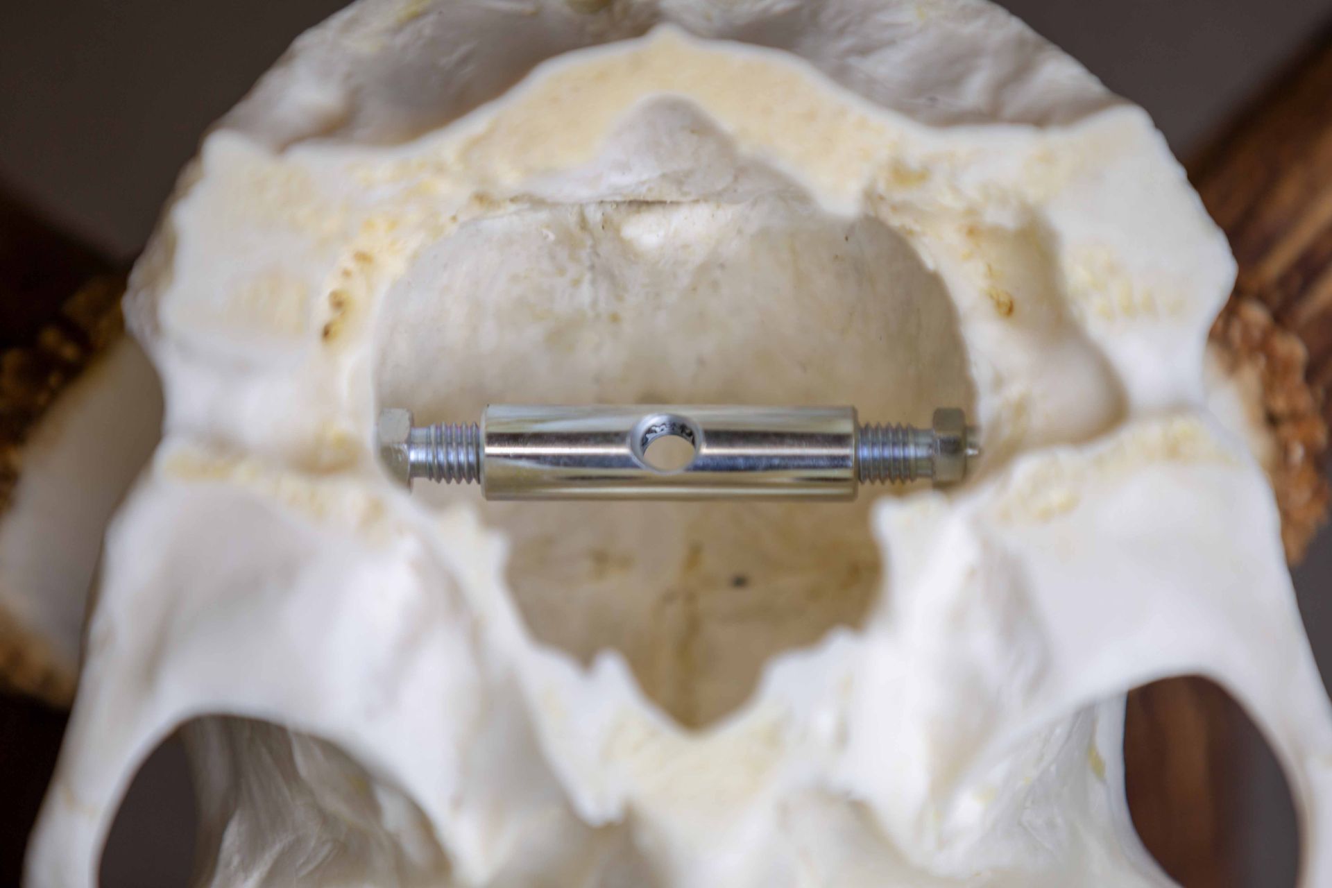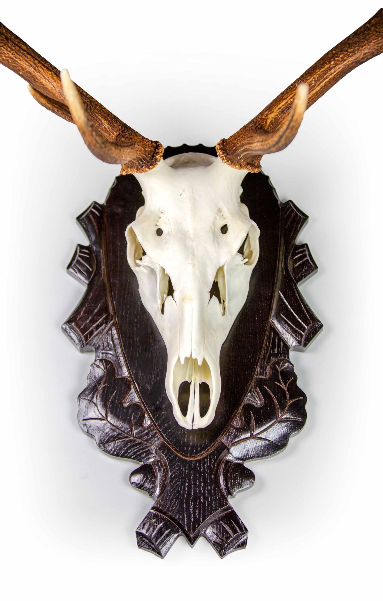 Fácil montaje en 3 pasos. Inserte el soporte en el cráneo y gírelo hasta que las espinas se agarren. Inserte el tornillo a través del escudo del trofeo y atorníllelo en el soporte. Gire hasta que el tornillo esté apretado en el escudo.