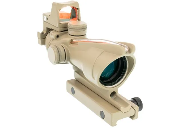 Esta fuente de iluminación ACOG 4×32 de fibra + mira RMR Dark Earth red dot de Aim-O ofrece un dispositivo de puntería óptica con un aumento de cuatro veces. La lente objetivo de 32 mm proporciona una gran entrada de luz, lo que da como resultado una imagen clara.