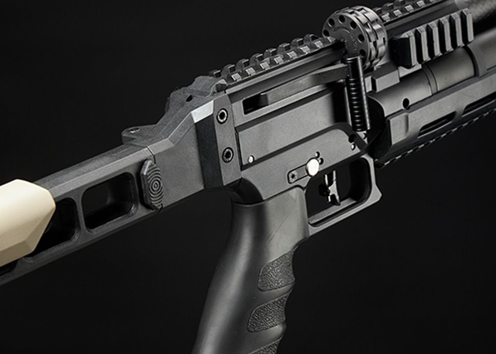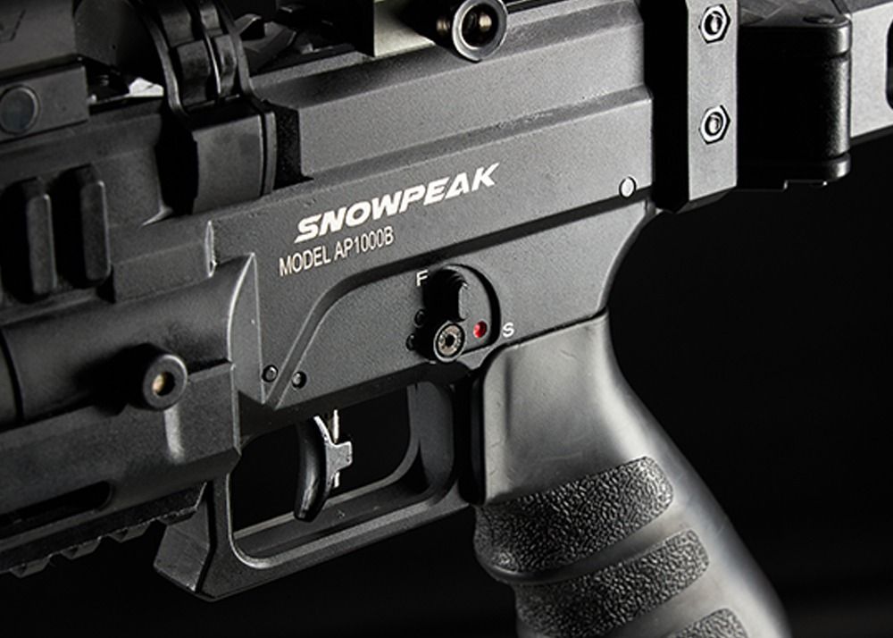 Su bajo peso (solo 2,6 kg) se puede atribuir al uso de piezas sintéticas de alta calidad y una cubierta de cañón de carbono. La culata plegable de la Snowpeak AP1000B Mercury CFB es sintética y esqueletizada, con una almohadilla de goma para la culata. Junto con la empuñadura de goma tipo pistola estilo AR-15, esta culata garantiza comodidad y control al usar el fusil. Un seguro para el pulgar añade aún más facilidad de uso.