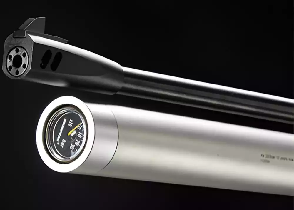 El Snowpeak PP30 está, por supuesto, regulado, lo que garantiza que cada balín se dispare con una potencia constante. El manómetro, ubicado en la parte delantera del depósito de aire, muestra claramente la presión de llenado actual. Un cilindro de aire completamente cargado (máximo 250 bar) proporciona aproximadamente 100 disparos.