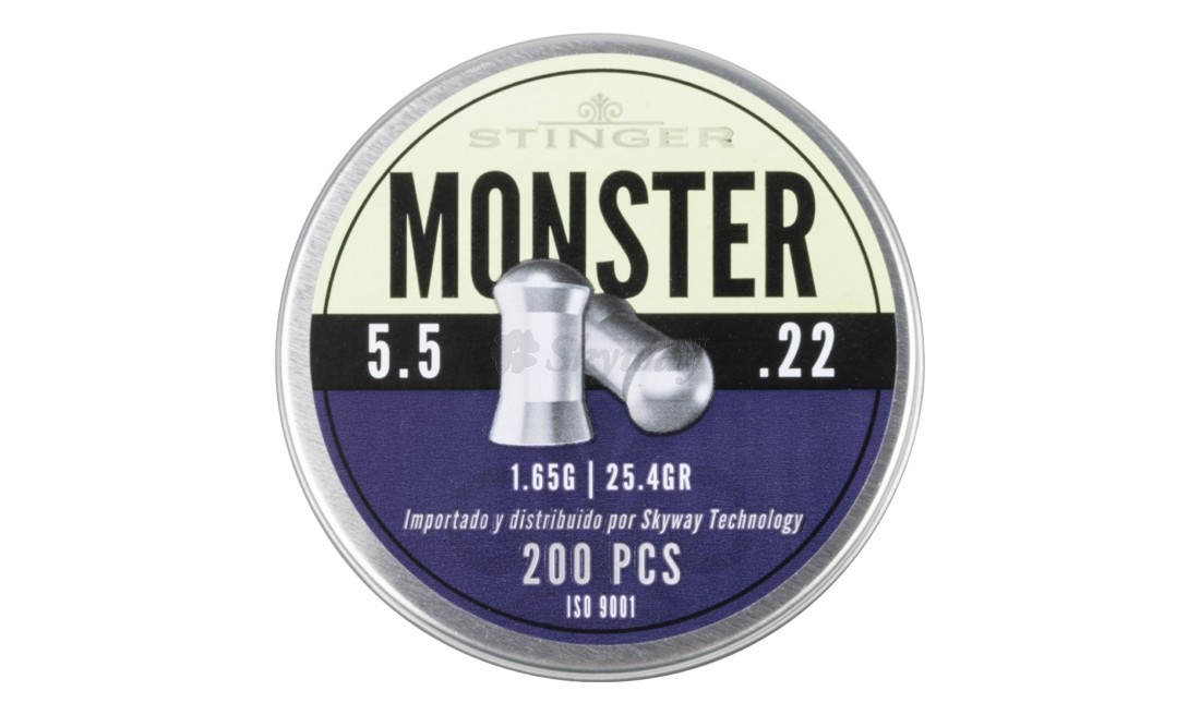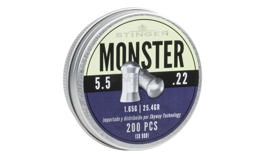 Los STINGER Monster 5,5mm (.22) son balines de 1,65 gramos diseñados para ofrecer una combinación perfecta de potencia y precisión. Su diseño aerodinámico proporciona una trayectoria estable, logrando un impacto fuerte y efectivo en cada disparo. Fabricados con plomo de alta calidad, estos balines son ideales para disparos a media y larga distancia, garantizando una alta penetración y precisión.