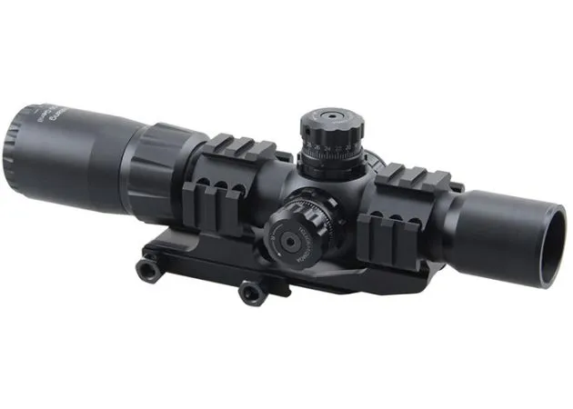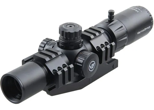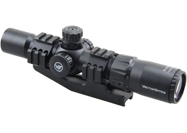 El visor Vector Optics Mustang Gen II 1-4×30 Chevron ofrece un amplio campo de visión con un potente aumento de cuatro veces en un cuerpo compacto.