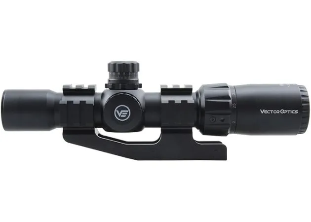 La retícula del visor Vector Optics Mustang Gen II 1-4×30 Chevron es una retícula Chevron grabada con diseño MOA. Esta retícula está situada en el segundo plano focal y puede regularse en elevación y deriva mediante las torretas situadas en el exterior. Estas torretas son ajustables en ½ MOA por clic, con un máximo de 60 MOA para ajuste de elevación y deriva. Estas torretas también contienen un mecanismo de bloqueo con el que se puede fijar el ajuste y, por tanto, no cambiarlo accidentalmente.
