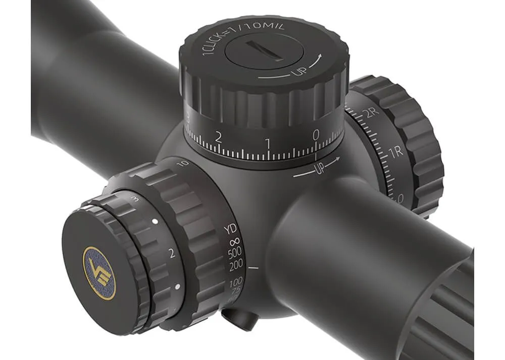 La torreta de elevación de este visor de rifle Vector Optics tiene un rango de ajuste máximo de 23 MIL, y la torreta de orientación tiene un rango de ajuste máximo de 15 MIL. Cada clic claramente audible de las torretas representa un ajuste de 0,1 MRAD. La carcasa del visor Vector Optics Taurus 6-24×50 HD está fabricada en aluminio 6061-T6 negro mate y tiene un peso de 974 gramos. Esta mira telescópica está purgada con nitrógeno, por lo que las lentes no pueden empañarse por dentro. Gracias a la clasificación de impermeabilidad IP67, este visor se puede sumergir a una profundidad de un metro durante un máximo de 30 minutos, sin que entre agua.